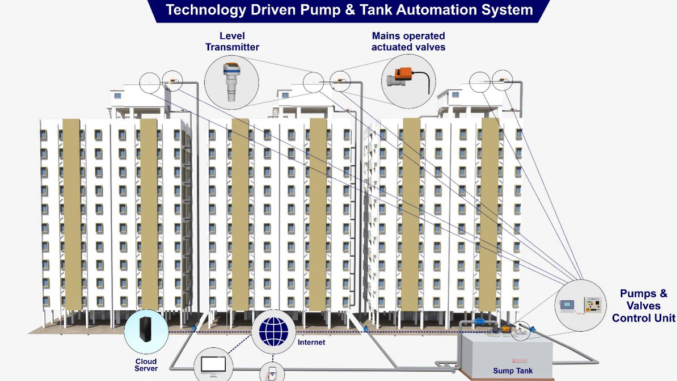 Water filling cycle starts when water level in any of the overhead tanks goes below 50% and pump is triggered ON. Automated valve shuts off water supply when individual overhead tank is full and Pump is shut off when all tanks are 100% full.